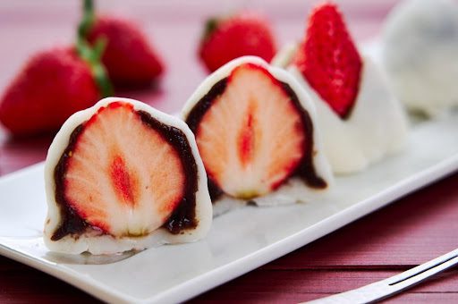 - เทแป้งไดฟุกุใส่ถาดที่โรยด้วยแป้ง คลุกแป้งนวลให้ทั่วตัวขนมแล้วตัดแบ่งออกให้เป็นชิ้น ตามจำนวนสตอเบอรี่ที่เตรียมไว้ พักไว้ให้คลายความร้อนแล้วนำมาห่อสตอเบอรี่ให้มิด ปั้นให้เนื้อเนียนเสมอกัน เสร็จแล้วค่ะ สำหรับเมนูเบเกอรี่ยอดนิยมของเราในบทความนี้